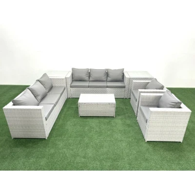 Outdoor Rattan Sofa Garden Furniture Set with 2 Armchairs Oblong Coffee Table Side Tables Light Grey Mixed Fimous