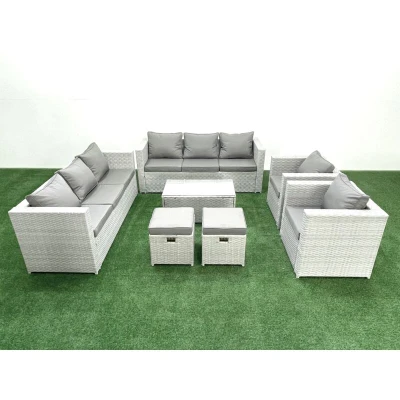 Outdoor Rattan Sofa Garden Furniture Set with 2 Armchairs Oblong Coffee Table Small Footstools Light Grey Mixed Fimous