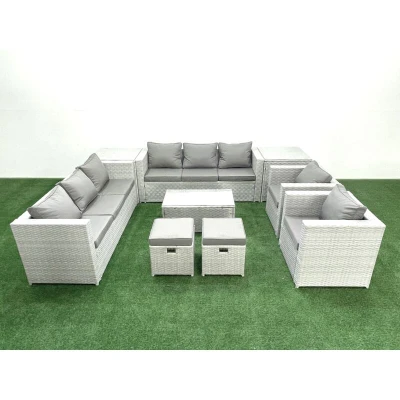 Outdoor Rattan Sofa Garden Furniture Set with 2 Armchairs Oblong Coffee Table Small Footstools Side Tables Light Grey Mixed Fimous