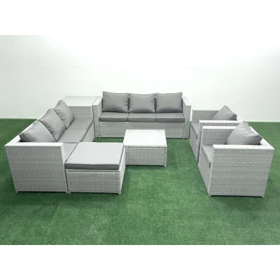 Outdoor Rattan Sofa Garden Furniture Set with 2 Armchairs Square Coffee Table Big Footstool Side Light Grey Mixed Fimous