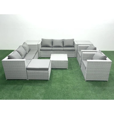 Outdoor Rattan Sofa Garden Furniture Set with 2 Armchairs Square Coffee Table Big Footstool Side Tables Light Grey Mixed Fimous