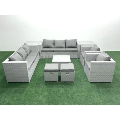 Outdoor Rattan Sofa Garden Furniture Set with 2 Armchairs Square Coffee Table Small Footstools Side Tables Light Grey Mixed Fimous