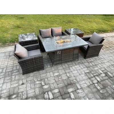 Outdoor Rattan Sofa Set Garden Furniture Gas Firepit Dining Table Heater with 2 Side Tables Dark Grey Mixed Fimous