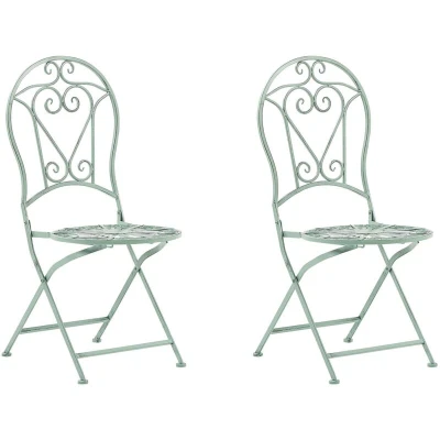 General description This set of 2 garden chairs in light green metal brings an utterly romantic atmosphere to your outdoor area. Ideal for small balconies or terraces, these foldable chairs provide a charming seating spot for two. With a distressed powder-coated finish, they beautifully complement vintage-inspired spaces filled with potted plants and flowers, perfect for enjoying your morning coffee. Technical specifications Product Type: Garden Chair Style: Retro General Color: Green Shade: Light Green Main Material: Iron Legs Material: Metal Seat Material: Metal Armrests: No Finish: Powder Coated Foldable: Yes Stackable: No Dimensions: Depth: 57 cm, Seat Height: 44 cm, Width: 42 cm, Height: 95 cm, Seating Surface: 40x40 cm Weight: 5 kg Weight Capacity: 120 kg Usage Well-suited for a variety of home decor styles Chic look for both indoor and outdoor use Easy care with durable materials Folding feature allows for space-saving storage Other information Assembly Information: Does not