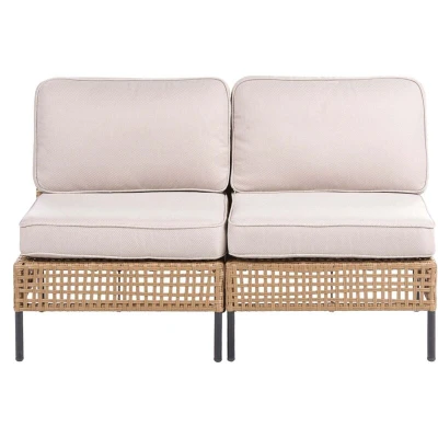 Armless Outdoor Sofa with Cushions. Create a comfortable outdoor lounge area with this stylish sofa, designed for everyday relaxation. Made from a robust powder-coated steel frame and weather-resistant PE rattan, it offers long-lasting durability and a modern look. Soft cushions with removable covers ensure comfort, while an easy modular connector lets you use it as a two-seater or separate it into two individual chairs - a perfect solution for a flexible setting in patio, terrace, or garden. Details: Product Type: Garden Sofa Style: Mediterranean General Color: Beige, Black Shade: Light Beige Material Type: PE Rattan Main Material: PE Rattan Additional Material: Steel Material Composition: 100% Olefin Seat Foam Density: 24 kg/m3 Seats Up To: 2 People Dimensions: Depth: 68 cm Seat Thickness: 9 cm Seat Height: 31 cm Width: 130 cm Height: 80 cm Seating Surface: 128x64 cm Weight: 17 kg Weight Capacity per Person: 120 kg Offer Includes: 2 x Chair Module, 2 x Backrest Cushion, 2 x Seat