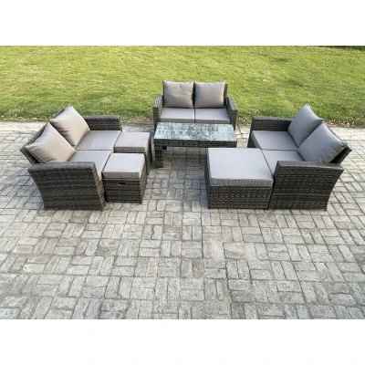 General description This Fimous Outdoor U Shape Sofa Set is crafted from high-quality PE rattan and features a durable galvanized steel construction, ensuring sturdiness and longevity. This versatile furniture set can be used both indoors and outdoors, making it perfect for patios, balconies, or gardens. Its design combines country chic with modern minimalism, adding an elegant touch to any space. Technical specifications Big footstool dimensions: 65L x 65W x 34H cm Small footstool dimensions: 40L x 40W x 37H cm (2 pieces) 2 Seater sofa dimensions: 124L x 70W x 74H cm (3 pieces) Coffee table dimensions: 105L x 50W x 48H cm Seat cushion thickness: 8 cm Material: PE rattan, galvanized steel frame, 5mm thick clear tempered glass Installation The sofa set comes flat-packed and requires self-assembly. All necessary components are included for easy setup. Usage This outdoor furniture set is low maintenance, featuring removable cushion covers for easy cleaning. It is recommended to keep the