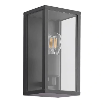 Lights.coPeldar outdoor wall light for illuminating your patio and entrance The dark grey Peldar outdoor wall light impresses with its clearly defined shapes and striking look. The rectangular housing is made of aluminium. The lampshade is made of glass, offering an unobstructed view of the light source. For this reason, the bulb to be used should be chosen with care. Energy-saving LED bulbs in a trendy filament look or in a nostalgic rustic form are ideal here.