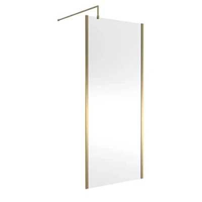 AmazonAdd luxury and elegance to your bathroom with a spacious walk-in wetroom enclosure. Hudson Reed wetroom screens make it easier than ever to add an area of relaxation to your bathroom. The brushed brass profile makes this Hudson Reed wetroom screen a stunning focal point in any bathroom. This contemporary wetroom screen will be a welcomed addition in any modern bathroom. The single-sided 'Shower Shield' coated glass makes cleaning a breeze, keeping your bathroom looking like new for longer. Perfect for use in a wetroom, or pair with a slimline shower tray from Hudson Reed. Manufactured from high quality toughened 8mm safety glass for your peace of mind. With an eye-catching and luxurious Brushed Brass profile and outer frame, it will perfectly complement any modern bathroom design. Wall fixed with top support arm. DIMENSIONS - H: 1950mm, W: 900mm, D: 14mm Lifetime Manufacturer's Guarantee, Weight: 89.948602896 Pounds, Manufacturer: Hudson Reed