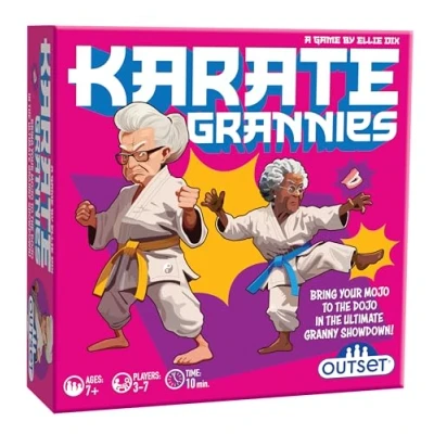 Do you have the skills, strategy, and sass to outwit the competition and claim the ultimate Granny glory? KARATE GRANNIES brings the mojo to the dojo in a hilariously high-stakes clash of knitting and martial arts Outsmart or outpower your opponents to collect Granny’s favourite items - Knitting Needles, Slippers, Teapots, Cupcakes and Hair Curlers - by outsmarting your opponents or unleashing a Karate Granny - but beware - these grannies mean business Includes 60 cards, 10 tokens Fast Play game (under 15 minutes) Ages: 7+ Players: 3 to 7, Manufacturer: Outset Media