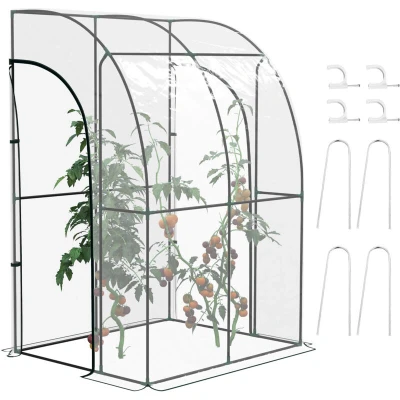 General description This Outsunny walk-in garden greenhouse is designed for home gardening, even in limited spaces. The lean-to design allows it to stand next to a flat surface, such as the side of a wall or outer house, making it ideal for maximizing space. The greenhouse features a robust powder-coated steel frame and a plastic cover that protects your plants, vegetables, and flowers from light wind and rain while allowing ample sunlight to penetrate, ensuring your plants thrive and grow to their fullest potential. Technical specifications Overall Dimension: 143L x 118W x 212H cm Door Size: 74W x 180H cm Plastic Cover Thickness: 0.1 mm Material: Plastic Cover, Steel Colour: Clear, Green Other information Assembly required; wall nails and ground stakes included Not suitable for bad weather conditions