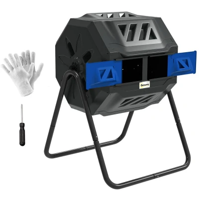 General description At home and healthy compost made easy and efficient with the Outsunny 160L dual compost bin. This compost bin features two chambers: one side for inserting waste and the other for holding ready-made compost. The body is constructed from durable plastic, supported by a strong metal frame, ensuring longevity and stability. The shell rotates 360° to mix contents effortlessly, eliminating the need for manual mixing. Technical specifications Colour: Blue, Black Material: Steel, PP Overall Dimension: 71L x 65W x 96H cm Bucket Size: Φ60 x 65L cm Height Above the Ground: 37 cm Chamber Door: 22.5L x 13.5W cm Capacity: 160L Item Label: 845-490V00BU Usage Two chambers with a generous 160-litre capacity for ample compost production 360° tumbling design for hands-free mixing 16 ventilation holes for effective decomposition of food waste Includes garden gloves for hand protection during use Other information Assembly required