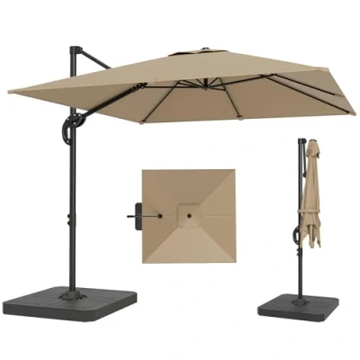 ManoManoEnjoy effortless shade with this Outsunny cantilever garden parasol with base weights, designed for flexible comfort on sunny days. The fade-resistant 200 gsm polyester canopy with UPF50+ protection blocks harsh UV rays while keeping colours fresh. With smooth 360° rotation and five adjustable tilt positions, you can follow the sun and create shade where you need it. Even better, fillable base weights are included—no need for extras—so you can set up securely and relax with confidence. Specifications: ● Colour: Khaki ● Material: Polyester, Aluminium, Metal ● Overall Dimensions: 310L x 244W x 257H cm ● Canopy Dimensions: 244L x 244W cm ● Closed Dimensions: 100L x 100W x 257H cm ● Cross Base Dimensions: 100L x 100W x 6H cm ● Weight Overall Dimensions: 100L x 100W x 10H cm ● Single Plate Dimensions: 49.5L x 49.5W x 10H cm ● After Filling Weight: 80 kg (Water), 100 kg (Sand) ● Item Label: 84D-475V00KK ● NOTE: Do not use umbrella during extreme weather (strong wind, heavy rain, snow). Just