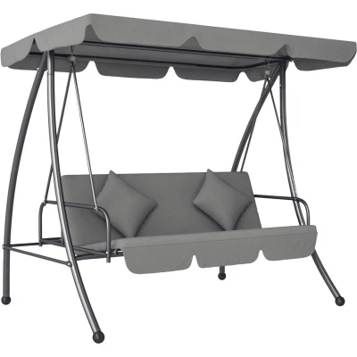 Make the most of the sunny days with this 2-in-1 convertible outdoor swing chair from Outsunny. Big enough to fit three people, 3 seater garden swing easily converts into a bed with an adjustable backrest to suit you and a canopy to protect you from hot sun. Garden swings for adults sit on a steel frame for stability and reliability. With two pillows supplied to provide even more comfort, there's no better way to enjoy to sit down and relax as the sun shines on a hot summers day. Specifications: ● Colour: Light Grey ● Material: Steel, Polyester ● Overall Dimension: 200L x 125W x 170Hcm ● Seat Size: 160L x 50Wcm ● Seat Height: 45cm ● Bed Size: 152L x 96Wcm ● Pillow Size: 40L x 40Wcm ● Weight Capacity: 340kg ● Custom Label: 84A-062V70LG Just so you know: this item ships and arrives in separate boxes. Delivery times may vary with each box. Box quantity: 2 Features: ● Swing seat with canopy, great for relaxing in the garden during the summer. Seats three people ● Quickly and easily