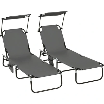 Outsunny 2 Piece Folding Sun Loungers with Canopy, Adjustable Recliner Garden Chairs Side Pocket, Steel Frame and Breathable Mesh for Outdoor, Pool, Beach, Garden, Dark Grey