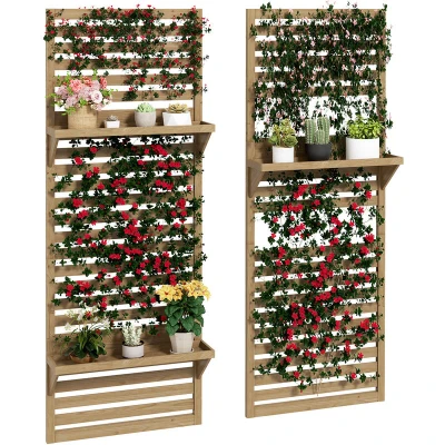 Outsunny 2 Piece Wooden Plant Stands with Hanging Shelves & Slatted Trellis Natural