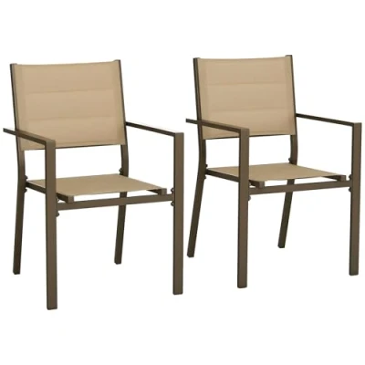 Outsunny 2 Pieces Garden Dining Chairs, Aluminium Outdoor Armchair for with Breathable Mesh Fabric, Stackable Design, Khaki