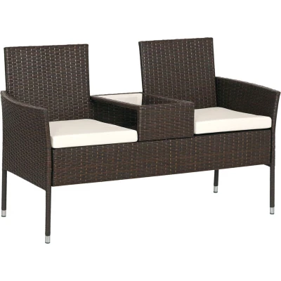 General description This Outsunny double rattan wicker chair combines two chairs and a coffee table into a single unit, providing a perfect place to sit and relax outdoors with your favorite person. The middle table features a sleek tempered glass top, offering a handy holding place for drinks or snacks. Technical specifications Colour: Brown, Cream White Material: PE Rattan, Steel, Glass, Polyester Overall Dimension: 137W x 59D x 82H cm Seat Size: 45W x 47D x 42H cm Back Size: 45W x 44H cm Tabletop Size: 25.5W x 45.5D cm Bottom Shelf Size: 30W x 45D x 15H cm Weight Capacity (Per Seat): 120 kg Item Label: 867-181V70BN Usage The bench is designed for outdoor use, perfect for gardens, patios, or balconies. The cushions provide added comfort, and their removable and washable covers make maintenance easy. Other information Assembly is required.
