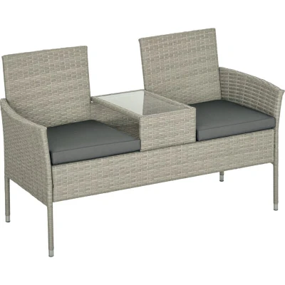 Outsunny 2 Seat Rattan Garden Bench, Patio Wicker Chair with Glass Tea Table, Outdoor Love Padded Cushions, for Garden, Porch, Mixed Grey/Grey