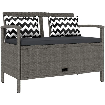 Outsunny 2 Seater Garden Storage Bench with 160L Capacity, PE Rattan Storage, Wicker Outdoor Loveseat Cushion, Pillows and Steel Frame for Patio, Grey