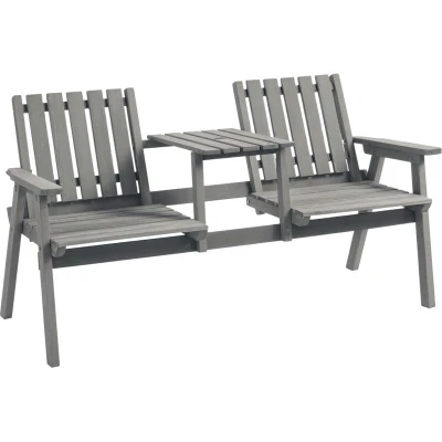 General description Get the most out of the warm weather with a friend, thanks to the Outsunny 2-Seater Wooden Garden Bench. This outdoor bench combines two seats with a convenient middle table, making it perfect for enjoying your garden or patio. Made from durable fir wood, the structure is strong and weather-resistant, ensuring it is suitable for outdoor use. The middle table features a central hole for a parasol, providing a shaded spot to relax in the sun. The slanted back and armrests enhance comfort, making this bench an ideal addition to your outdoor space. Technical specifications Colour: Grey Material: Fir Wood Overall Dimension: 83H x 152W x 70D cm Seat Size: 53W x 46D cm Back Size: 46W x 45H cm Seat to Floor Height: 42 cm Weight Capacity: 250 kg Usage Use wood paint and a garden cover for extra protection and longevity. The slatted design helps prevent water build-up, reducing the risk of rot and decay. Enjoy outdoor moments with a friend on this comfortable bench.