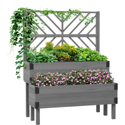 Elevate your garden this season with Outsunny's 2-box tiered garden planter. Featuring a convenient trough shape, these planters offer lots of space to organise and grow flowers, vegetables and herbs. Keep plants elevated to deter weeds and wild animals while reducing strain on your back. Utilize the trellis wall for climbing plants and hanging pots. With self-draining features and reinforced construction, gardening is easier and more efficient. Specifications: ● Colour: Grey ● Material: Fir Wood ● Overall Dimensions: 108W x 62.5D x 140H cm ● Single Planter Inner Dimensions: 105W x 31D x 26H cm ● Trellis Dimensions: 102W x 60H cm ● Leg Height: 20 cm ● Weight Capacity: 40 kg ● Item Label: 845-902V00GY Features: ● The raised garden bed comprises 2 elevated planter boxes and a trellis ● Elevated design reduces strain by eliminating the need for bending ● Solid metal corner brackets provide stability and durability ● Includes drainage holes to prevent waterlogging ● Non-woven inner bag