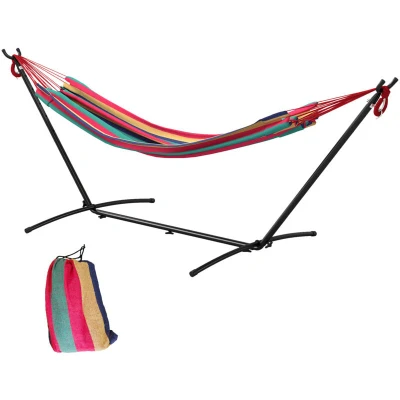 AmazonMODERN DESIGN AESTHETIC: Featuring a uniquely modern shape with multicolor stripe design, this outdoor hammock with stand really stands out from the crowd to provide the perfect aesthetic to your outdoor living space ADJUSTABLE HEIGHT: There are 6 holes evenly distributed on each tilt bracket, you can adjust the height of the canvas hammock by changing the position of the hook STABLE & PORTABLE: Made from sturdy metal, the indoor hammock offers reliable strength and stability. Colorful polyester cotton fabric provides extra comfort. Comes with a handy bag for easy moving WIDE USAGE: It's nice and roomy enough for an individual to enjoy leisure time or simply nap. Ideal for seaside, forest, courtyard, dormitory and so on with our garden hammock. DIMENSION: Overall Dimension: 298L x 117W x 105H cm, Weight Capacity: 120kg; Note: The fabric cannot be washed