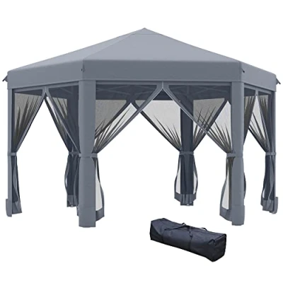 Outsunny 3.2m Outdoor Pop Up Gazebo Hexagonal Canopy Tent with Mesh Sidewalls Handy Bag84C 227CG