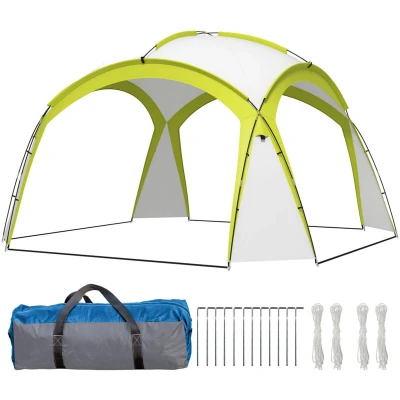 General description Enjoy the outdoors all year round with this dome tent gazebo from Outsunny. The 3.5 x 3.5m size is spacious enough to accommodate plenty of friends and family, with open side designs allowing extra space and providing ample air circulation throughout the day and night. Technical specifications Colour: Cream and Green Material: Fibreglass Pole, Polyester Overall Dimension: 350L x 350W x 222H cm Door Size: 240L x 182H cm Fibreglass Pole Size: Ф11mm, Ф9.5mm Hook Max Load: 1kg Item Label: 84C-110V00GN Compatibility and accessories Includes 12 ground pegs Includes 4 guy ropes Includes a carry bag Installation Set up with the included ground pegs and guy ropes to secure it firmly into the ground. Usage Ideal for BBQs, picnics, outdoor events, and more. Features an inner top hook for hanging night lanterns. Other information Never use open flames.