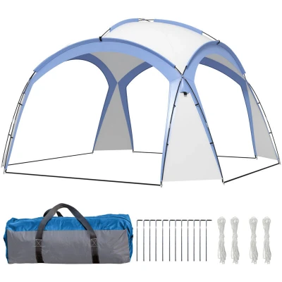 Enjoy the outdoors all year round with this dome tent gazebo from Outsunny. 3.5 x 3.5m size is spacious enough to fit plenty of friends and family under, with the open side designs allowing extra space to spill out if needed, as well as providing plenty of air circulation all day and night long. Set comes with 12 ground pegs and four guy ropes to hold it firmly into the ground. You can take this beach shelter in the included bag to BBQs, picnics, outdoor events and more. Specifications: ● Colour: White and Light Blue - Material: Fibreglass Pole, Polyester - Overall Dimension: 350L x 350W x 222H cm - Door Size: 240Lx182H cm - Fibreglass Pole Size: Ф11mm, Ф9.5mm - Hook Max Load: 1kg - Item Label: 84C-110V00LB Features: ● Fibreglass pole structure is tough and stands gazebo in place ● PU coated polyester shell creates safe shelter against UV/sun rays and light wind and rain ● Generous size, with four open size creates a spacious feel ● Inner top hook for night lanterns. Never use open