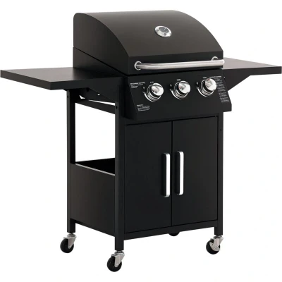 Outsunny 3 Burner Gas BBQ Grill Outdoor Portable Barbecue Trolley w/Warming Rack, Side Shelves, Storage Cabinet, Thermometer, Carbon Steel, Black