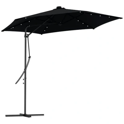 ManoManoGeneral description From day to night, the Outsunny 3(m) Cantilever Garden Parasol Umbrella enhances your outdoor experience. It features solar-powered LED lights on the ribs that charge during the day and illuminate at night, allowing you to enjoy your outdoor space beautifully after sunset. Technical specifications Size: 3 meters Color: Black Weight capacity for cross base: 60 kg Other information Includes a cross base