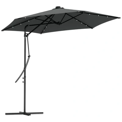 ManoManoGeneral description From day to night, the Outsunny 3(m) Cantilever Garden Parasol Umbrella enhances your outdoor experience. This stylish umbrella features solar-powered LED lights on the ribs, which charge during the day to illuminate your evenings beautifully. Technical specifications Size: 3 meters Cross base included Weight required for stability: 60 kg