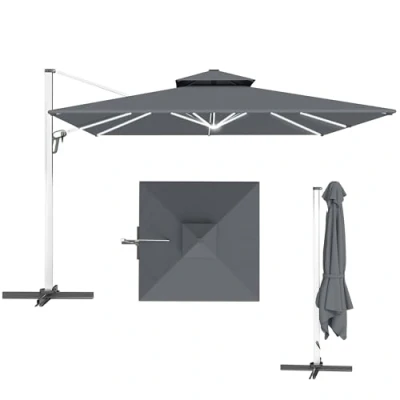 AmazonSpacious & stylish shade: This 3(m) cantilever umbrella provides lots of coverage, suitable for patios, outdoor dining and gatherings. Made with 250 gsm yarn-dyed fabric and a PA coating, it resists fading and stays vibrant season after season. Solar-powered lighting: This umbrella features 15 LED light strips along the ribs and a central light, creating a warm and inviting ambiance at night. It can easily switch between cold and warm lighting to match any mood. Durable & wind-resistant: Built with a rust-proof aluminium pole and 8 ribs, this large garden parasol ensures lasting durability. A cross base adds extra stability, while the top vent allows airflow, reducing wind pressure. Effortless adjustability: Customise your shade with 360° rotation, five tilt angles and adjustable height settings, ensuring comfort at any time of day. Convenient & smooth operation: The user-friendly crank lift mechanism allows seamless opening and closing, making setup and storage hassle-free.