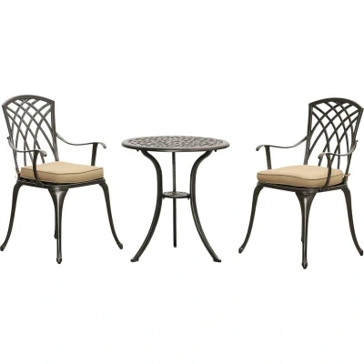 Outsunny 3 Piece Cast Aluminium Garden Bistro Set for 2, Outdoor Coffee Table Rust Resistant with Parasol Hole, Cushions, Patio and Chairs Garden, Balcony, Bronze Tone