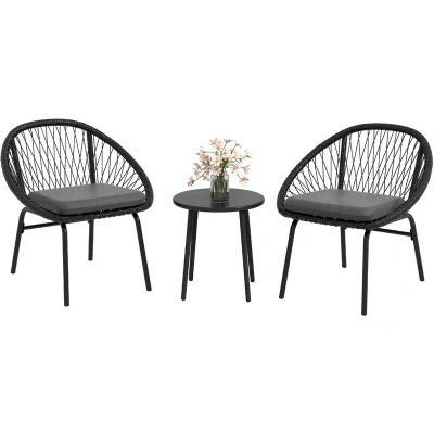 General description Go for style and comfort with this Outsunny three-piece garden furniture set, which includes two tub-shaped rattan chairs and a round coffee table. The metal tabletop provides a strong and sleek surface that is easy to clean with a damp cloth. The chairs come with soft padded cushions for added comfort, making this set an all-season all-rounder, perfect for your patio, balcony, terrace, or garden. Technical specifications Colour: Black, Dark Grey Material: Steel, PE Rattan, Polyester Chair Dimension: 70W x 63D x 73H cm Table Dimension: Φ40 x 45H cm Seat Size: 43W x 45D cm Seat Height (without cushion): 40 cm Cushion Thickness: 4 cm Weight Capacity: 120 kg (chair), 30 kg (table) Certifications: BS5852, EN581 Item Label: 863-144V70BK Installation Assembly is required for this furniture set. Usage This garden furniture set is ideal for outdoor settings such as patios, balconies, terraces, and gardens. Other information Cushion covers are removable and washable.