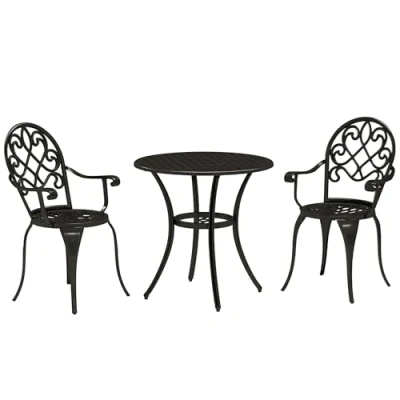 Easy elegance for the outdoors with this Outsunny three-piece garden bistro set. Comes with two chairs and a matching round table - sit with company. Made from aluminium, the garden table and chairs are strong pieces, which are suitable for outdoor use. Complete with adjustable feet to keep the pieces balanced. Specifications: ● Colour: Black ● Material: Aluminium ● Table Dimension: Φ66 x 67Hcm ● Chair Dimension: 46W x 42D x 90Hcm ● Seat Dimension: 39W x 38D x 42Hcm ● Armrest Height to the Seat: 18cm ● Weight Capacity: 30kg (Table), 120kg (Chair) ● Item Label: 84B-505V00BK Features: ● Three-piece set: two chairs and a small round table ● Aluminium pieces are strong and tough. Resistant to rust and suitable for outdoor use ● Adjustable feet to keep all pieces balanced ● Elegant carved line design: ● Great for outdoor spaces, such as gardens, patios and balconies ● Assembly required