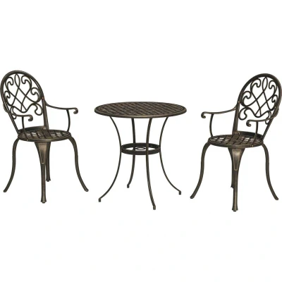General description Easy elegance for the outdoors with this Outsunny three-piece garden bistro set. It includes two chairs and a matching round table, perfect for enjoying time with company. Made from strong aluminium, this garden set is designed for outdoor use and features adjustable feet for stability. Technical specifications Colour: Bronze Tone Material: Aluminium Table Dimension: Φ66 x 67H cm Chair Dimension: 46W x 42D x 90H cm Seat Dimension: 39W x 38D x 42H cm Armrest Height to the Seat: 18 cm Weight Capacity: 30 kg (Table), 120 kg (Chair) Item Label: 84B-505V00TN Other information Resistant to rust and suitable for outdoor use Elegant carved line design Great for outdoor spaces, such as gardens, patios, and balconies Assembly required