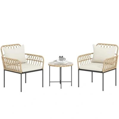 ManoManoSpruce up your outdoor space with the Outsunny rattan patio furniture set, featuring a round table and two chairs. Crafted from all-weather PE rattan with strong steel frames, this outdoor table and chairs set resists rust and UV damage. Enjoy comfy seating with thick cushions and a tempered glass-top coffee table that's a breeze to clean. Suitable for any garden, balcony, or patio! Specifications: ● Colour: Beige ● Materials: Steel, Polyester, PE Rattan ● Chair Dimensions: 68W x 68D x 81H cm ● Table Dimensions: Φ50 x 46H cm ● Seat Dimensions (without cushion): 53W x 53D x 37H cm ● Back Dimensions: 52W x 45H cm ● Seat Cushion Thickness: 5 cm ● Back Cushion Thickness: 10 cm ● Weight Capacity: 120 kg (chair), 30 kg (table) ● Item Label: 863-192V70BG Features: ● Includes round table and two chairs for compact spaces ● Steel frames with PE rattan resist rust and UV damage ● Protective foot pads safeguard floors from scratches ● Thick, soft cushions offer all-day seating comfort ●