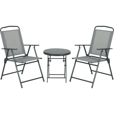 This Outsunny set comes with a round table and two matching chairs - enjoy time outdoors with company, practically anywhere. Powder coated metal frames mean strong cores to support you. Each piece is foldable - easy to carry and store away. The table is fitted with a tempered glass top - a sleek and safe finishing touch. Specifications: ● Colour: Light Grey ● Materials: Steel, Tempered Glass, Breathable Mesh Fabric ● Table Dimension: Ф45 x 50H cm ● Chair Size: 53.5W x 64D x 93H cm ● Folded Chair Size: 86L x 53.5W x 9D cm ● Folded Table Size: 64L x 45W x 7.5D cm ● Seat Size: 43W x 40D cm ● Seat Height: 42 cm ● Backrest Size: 43W x 45H cm ● Table Weight Capacity: 25 kg ● Chair Weight Capacity: 120 kg ● Item Label: 84G-282V00LG Features: ● Chairs have breathable mesh seats and armrests for comfort ● Folding table and chairs can be easily stored away when not in use ● The 5mm-thick tempered glass top is solid and sleek ● Powder-coated steel frames for a strong core ● No assembly required