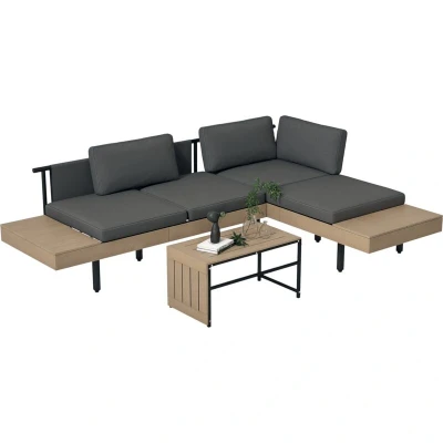 The 'L' shape design of the sofa set is ideal for maximizing corner spaces, providing both style and practicality. The natural tone wood-effect tops of the coffee table add a rustic touch, beautifully complementing the overall aesthetic of your outdoor area. This thoughtfully designed set harmonizes with various garden styles, enhancing the beauty of your outdoor environment.