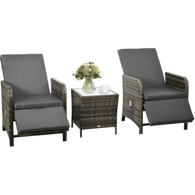 General description Revitalise your outdoors with the Outsunny 3 Pieces Rattan Bistro Set. This stylish garden set includes two reclining chairs and a middle table, perfect for relaxing with company. The adjustable backs and footrests allow you to find your ideal position, while the super comfortable cushions invite you to sink in and enjoy your time outdoors. The set is designed with non-slip feet to gently protect your floor. Technical specifications Colour: Mix-grey, Dark grey Materials: PE Rattan, Steel, Polyester Chair Dimensions: 65W x 70D x 100H cm Table Dimensions: 45W x 45D x 49H cm Tabletop: 40.5W x 40.5D cm Storage Shelf: 36W x 45D cm Seat Size: 54W x 50D cm Seat Height: 41 cm Backrest Size: 64W x 52H cm Adjustable Height: 85-100 cm Footrest Height: 8-21 cm Cushion Dimensions: 140L x 54W x 5H cm Chair Weight Capacity: 120 kg Table Weight Capacity: 30 kg Item Label: 863-143V70GG Installation Assembly required Usage Ideal for outdoor relaxation and dining Other information