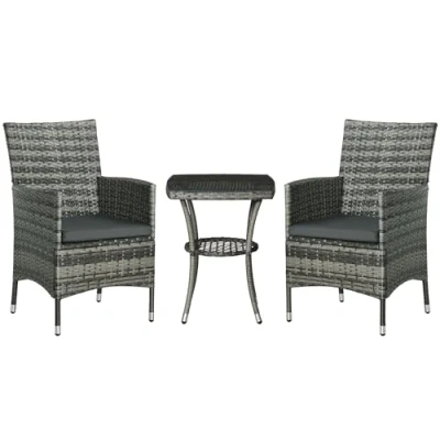 Outsunny 3 Pieces Rattan Bistro Set, Wicker Garden Furniture Set with 2 Tier Coffee Table and Chairs, Washable Cushions, for Outdoor Patio Balcony, Mixed Grey