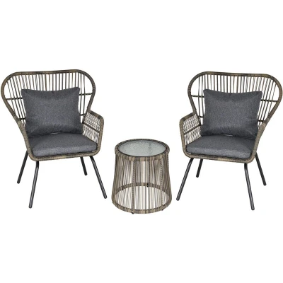General description A traditional garden set gets a modern update with this Outsunny seating set. The two chairs are designed in a wing shape, featuring a sturdy steel frame wrapped in elegant PE wicker with a unique webbed design. Each chair is complemented by comfortable back and seat cushions, while the round table, matching in design, is fitted with a durable glass top for long-term use. Technical specifications Color: Grey Material: Steel, PE Rattan Wicker, Polyester Overall Dimensions: Φ49 x 47H cm (table), 76.5W x 81.5D x 95.5H cm (chair) Seat Size: W45 x 54D cm Seat Height: 37 cm (without cushion) Weight Capacity: 30 kg (table), 160 kg (chair) Item Label: 863-061V70CG Usage Ideal for outdoor patios and gardens Perfect for relaxing or entertaining guests Other information