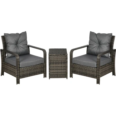 Outsunny 3 Pieces Rattan Bistro Set, Wicker Garden Furniture Set with Storage Coffee Table and Chairs, Thickened Cushions for Outdoor, Patio, Balcony, Grey