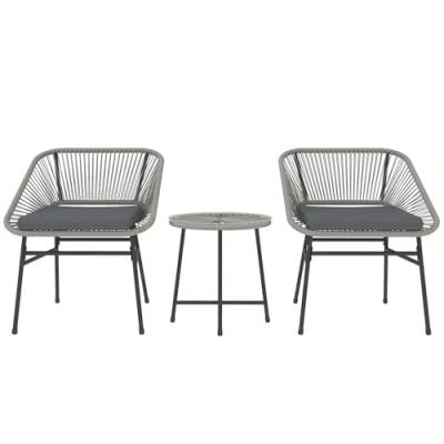 ManoManoGeneral description Brighten your outdoor space with the Outsunny garden furniture set, a charming bistro or a chic lounge addition for small spaces. This small balcony furniture set includes two chairs and a matching glass-top table, creating a stunning and cozy corner for friend hangouts, daily talks, and sunset viewing. Technical specifications Colour: Light Grey, Beige, Black Material: Steel, PE Rattan, Polyester, Tempered Glass Chair Dimension: 63W x 65D x 76H cm Table Dimension: Φ45 x 46H cm Seat Size: 56W x 46D cm Seat Height (without cushion): 42 cm Back Size: 44L x 56W cm Cushion Size: 45L x 45W x 5D cm Weight Capacity: 120 kg (chair), 30 kg (table) Item Label: 863-174V70LG Usage Ideal for small outdoor spaces such as balconies or patios Perfect for casual gatherings, relaxing, or enjoying meals outdoors Other information PE rattan wrapped on steel frames to resist rust, UV, and weather Soft seat cushion with fixing straps for extra comfort Tempered glass top table, easy to