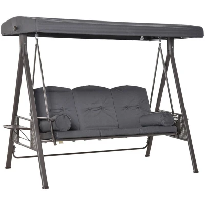 Outsunny 3 Seat Garden Swing Chair Patio Steel Bench w/ Cup Trays Grey