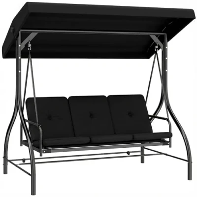 This Outsunny 3 seater garden swing is a welcome addition to any outdoor living space. It has a capacity to seat three people so you can enjoy with your friends. The adjustable canopy will keep you covered from sunlight and light rain. The swinging chair seat and back cushion is padded for comfort - the back can be folded flat to transform this into a bed. Specifications: ● Colour: Black ● Material: Metal, Polyester ● Overall Size: 195L x 117D x 175H cm ● Seat Size: 106L x 50D cm ● Cushion Thickness: 7 cm ● Flat Bed Size: 104L x 145W cm ● Canopy Size: 190L x 117.5W cm ● Weight Capacity: 240kg ● Item Label: 84A-031V01BK Features: ● Seats up to three people at once ● Adjustable canopy to protect from light rain and direct sun rays ● Padded cushion for comfort ● Texteline fabric and metal frame for durability ● Suitable for all garden and outdoor living spaces ● Maximum load 240kg, assembly required