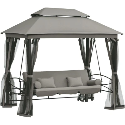 Outsunny 3 Seater Swing Chair in 1 Convertible Garden Seat Bed Gazebo Patio Bench Outdoor with Double Tier Canopy, Cushioned Seat, Mesh Sidewalls, Grey