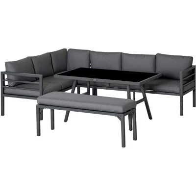 Outsunny 4 Piece L shaped Garden Furniture Set 8 Seater Aluminium Outdoor Dining Conversation Sofa w/Bench, Table & Cushions, Grey