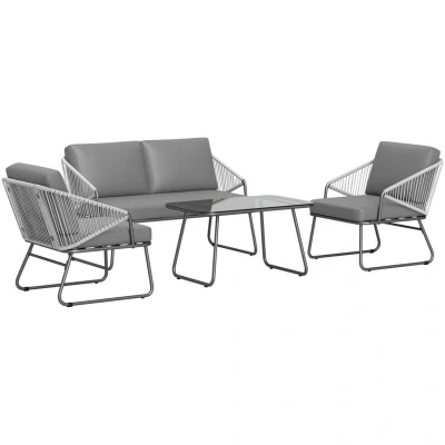 General description Outdoor relaxation done stylishly right with this Outsunny rattan sofa set. It includes a loveseat, two chairs, and a matching coffee table, making it perfect for any garden or patio setting. Technical specifications Colour: Grey, Dark Grey Material: Steel, PE Rattan, Polyester, Glass Loveseat Sofa Dimension: 107L x 70W x 69H cm Single Sofa Dimension: 68W x 70D x 69H cm Table Dimension: 80L x 50W x 43H cm Seat Size: 100W x 58D cm (loveseat), 50W x 58D cm (single) Seat Height (without cushion): 31 cm Back Length: 56 cm Cushion Thickness: 8 cm (seat), 15 cm (back) Weight Capacity: 240 kg (loveseat), 120 kg (single), 30 kg (table) Item Label: 860-380V70CG Usage Perfect for outdoor relaxation and entertaining. Thick seat and back cushions ensure comfort, with removable covers for easy washing. Glass tabletop is stylish and easy to clean. Other information This item ships and arrives in separate boxes. Box quantity: 2 Assembly required.